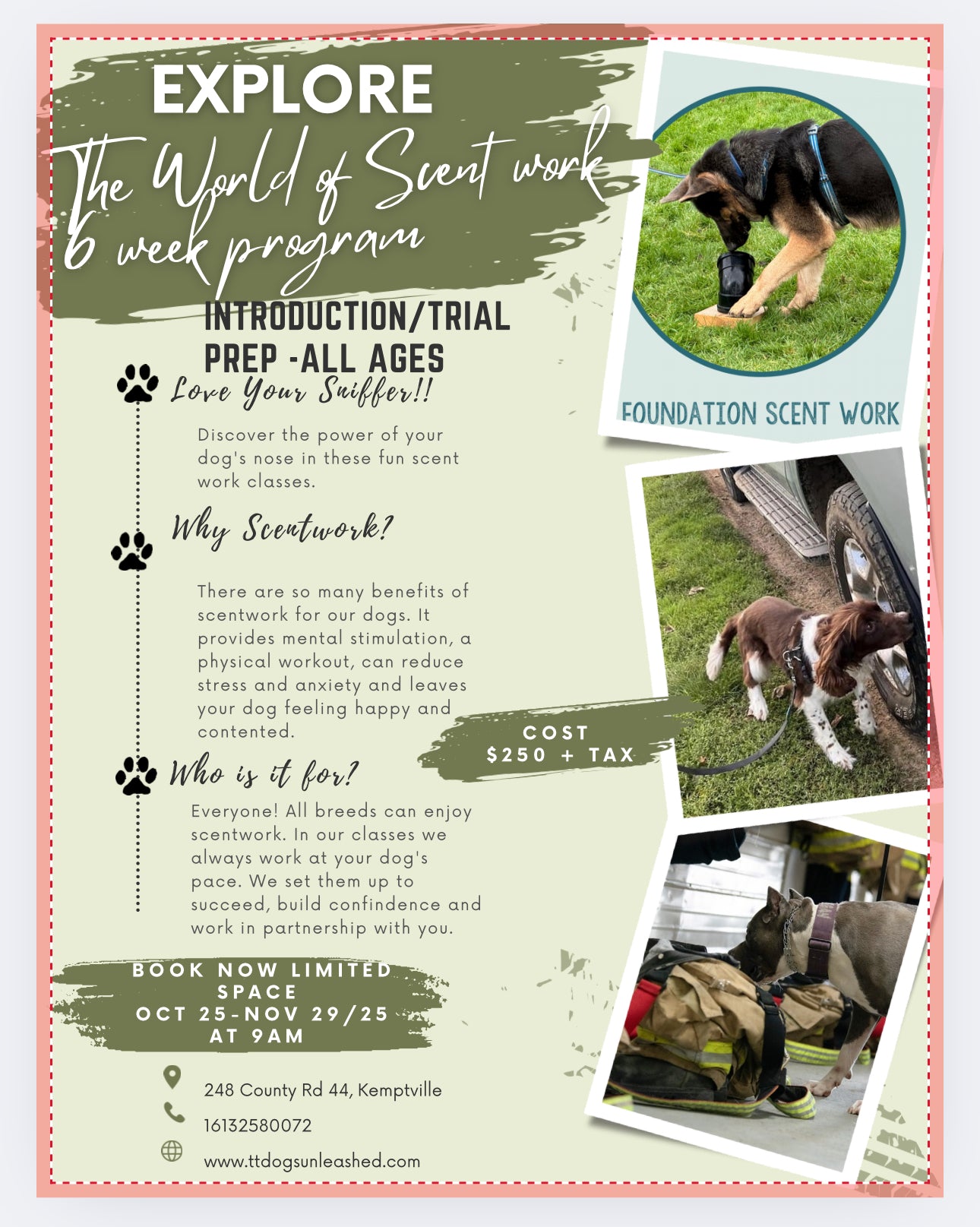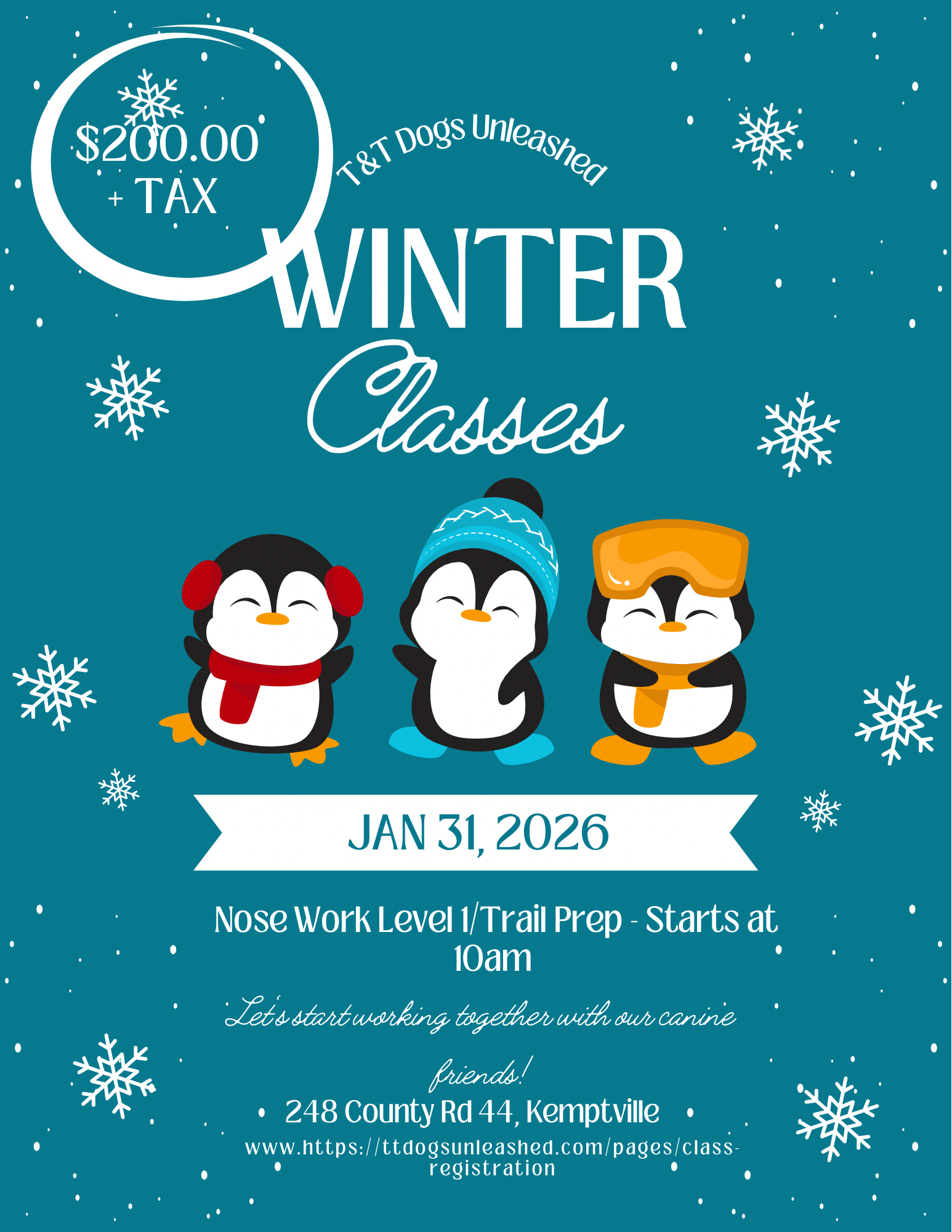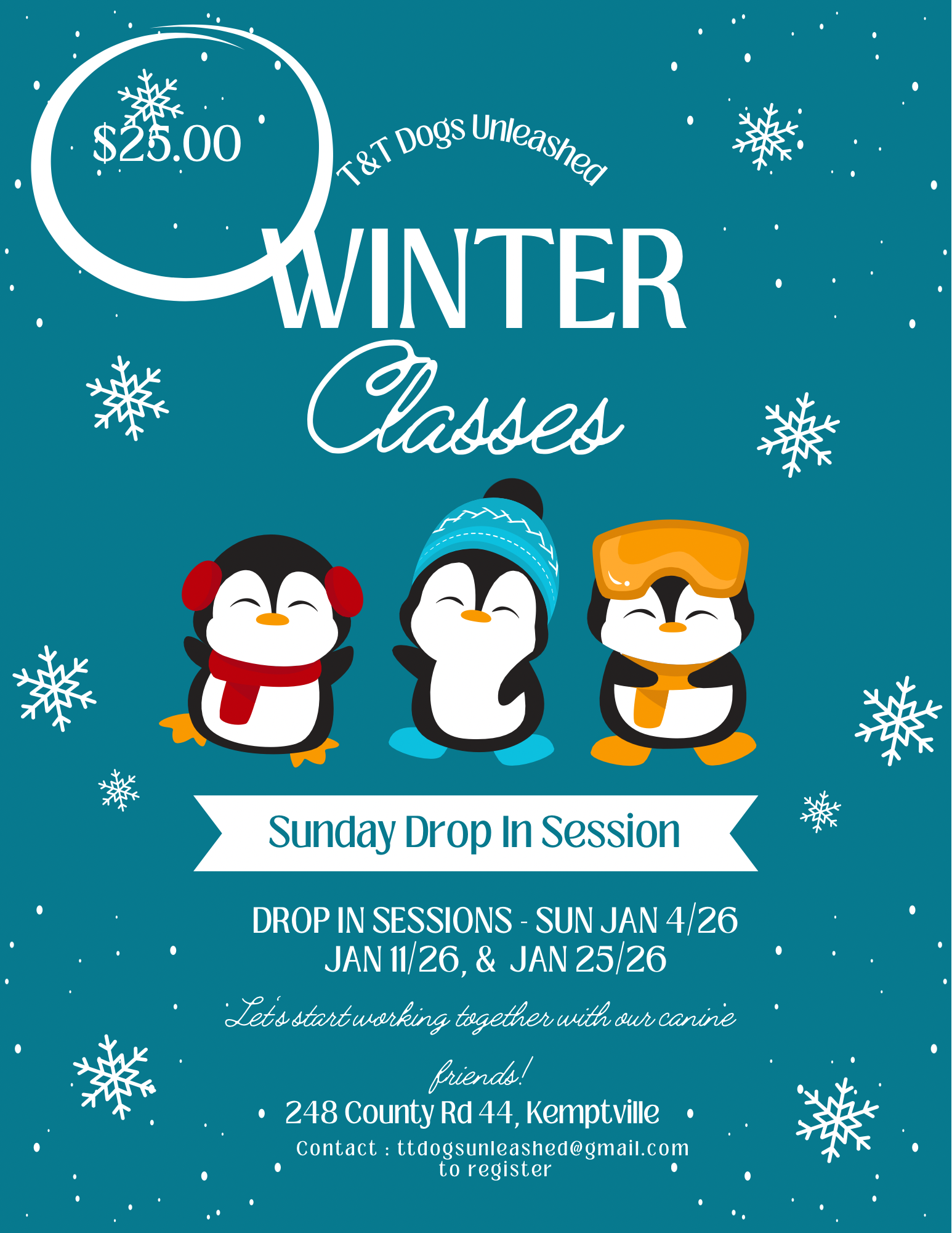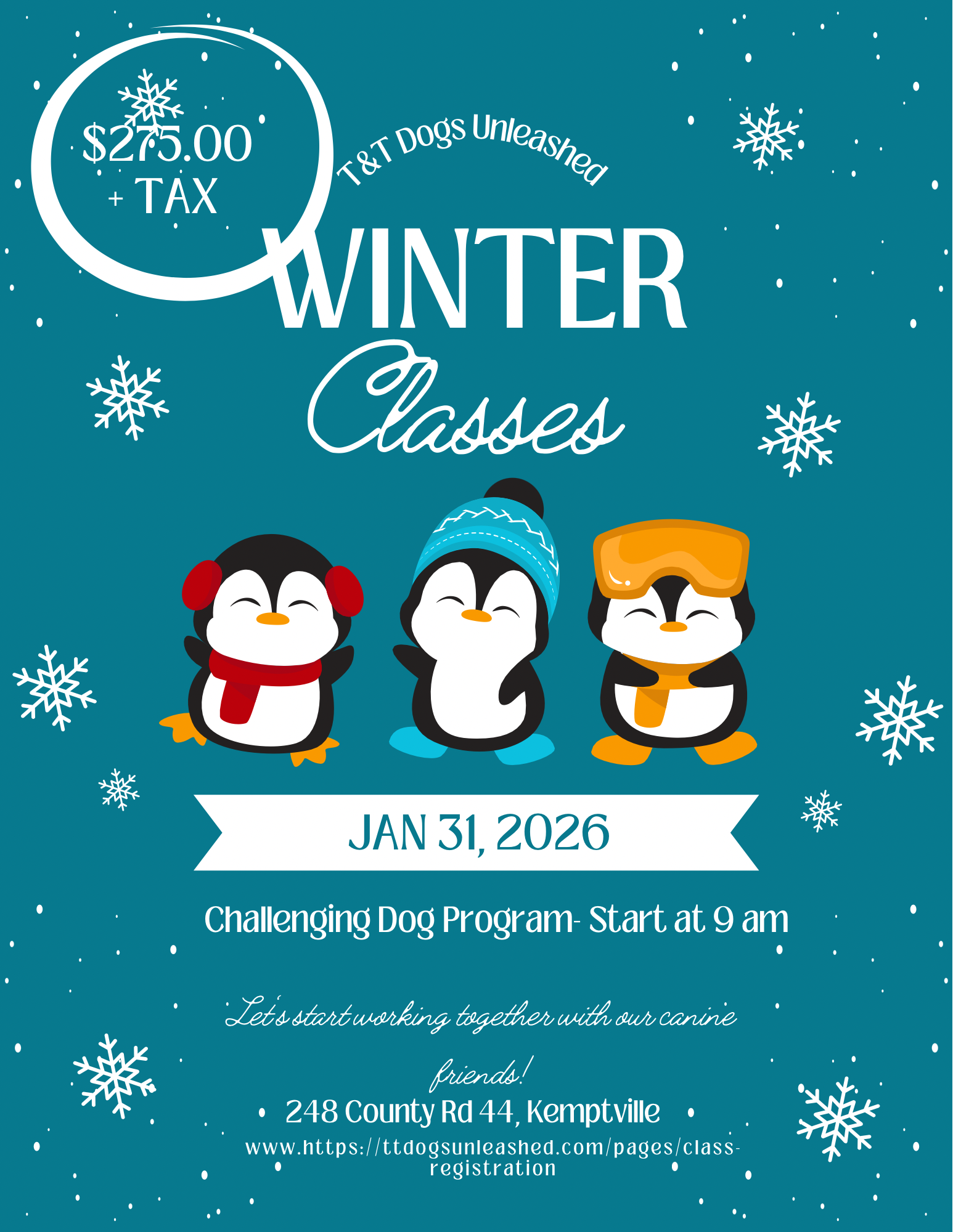 Please ensure you have also completed our registration form. Our current classes are listed with their associated pricing here. If you have any questions, please reach out to ttdogsunleashed@gmail.com or at 613-258-0072